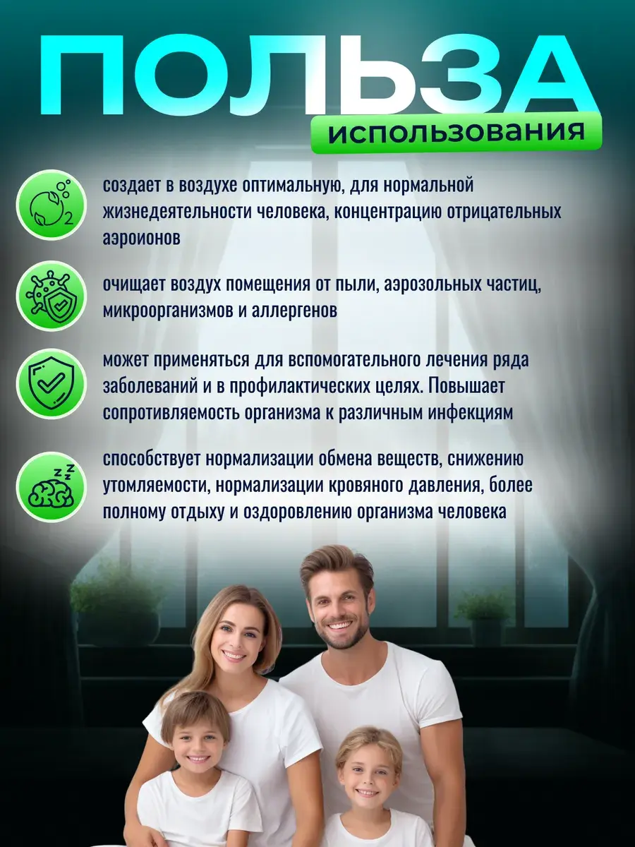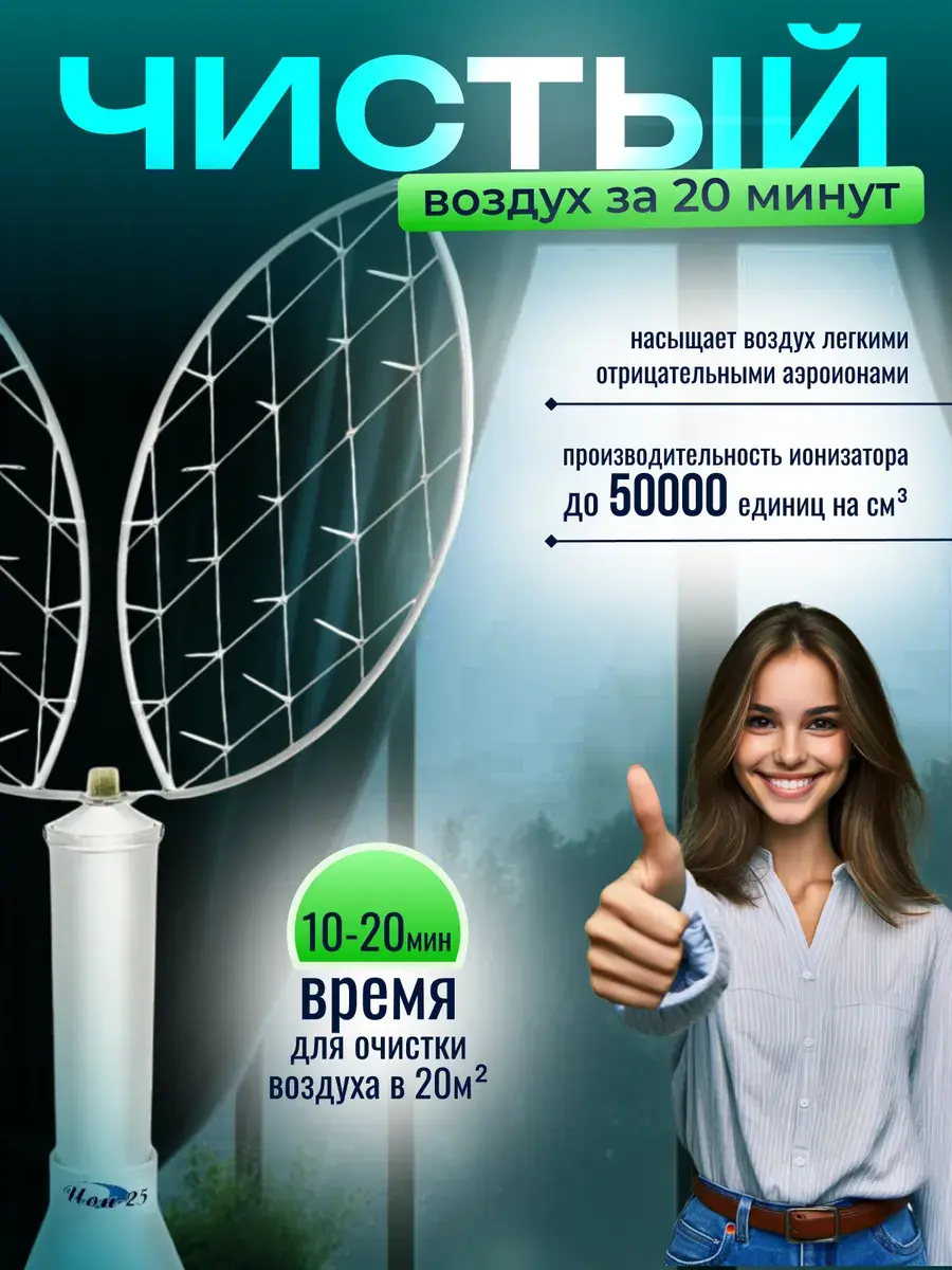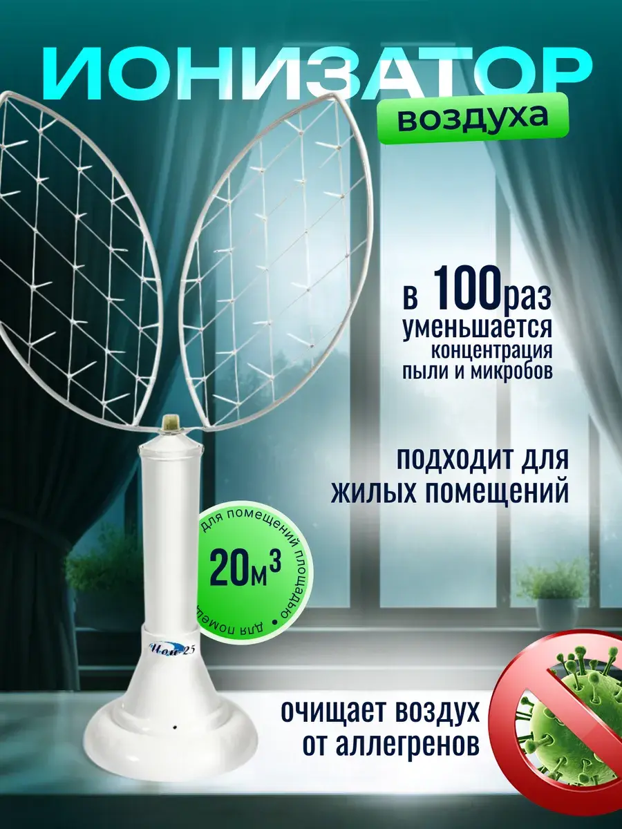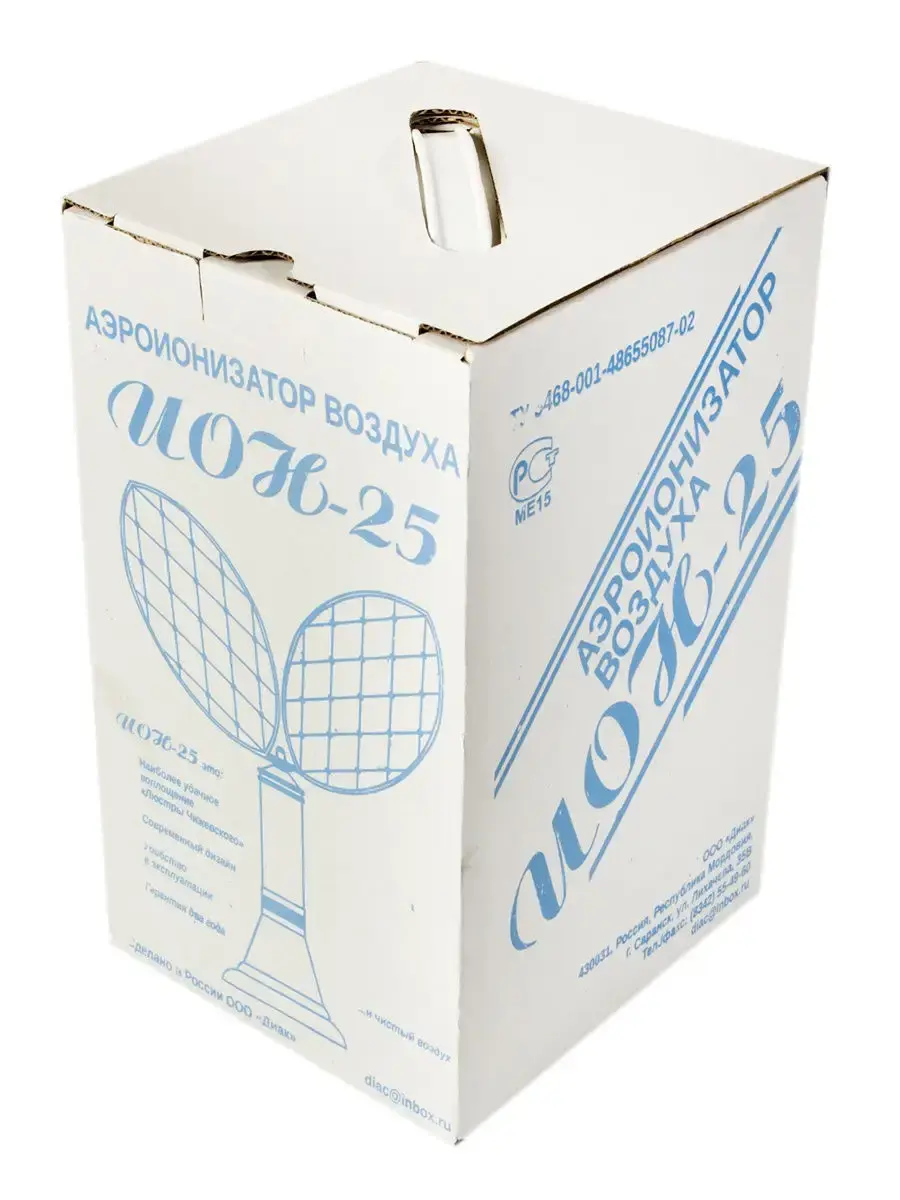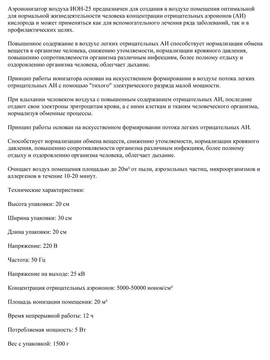 Аэроионизатор воздуха ИОН-25 предназначен для создания в воздухе помещения оптимальной для нормальной жизнедеятельности человека концентрации отрицательных аэроионов (АИ) кислорода и может применяться как для вспомогательного лечения ряда заболеваний, так и в профилактических целях. Повышенное содержание в воздухе легких отрицательных АИ способствует нормализации обмена веществ в организме человека, снижению утомляемости, нормализации кровяного давления, повышению сопротивляемости организма различным инфекциям, более полному отдыху и оздоровлению организма человека, облегчает дыхание. Способствует нормализации обмена веществ, снижению утомляемости, нормализации кровяного давления, повышению сопротивляемости организма различным инфекциям, более полному отдыху и оздоровлению организма человека, облегчает дыхание. Очищает воздух помещения площадью до 20кв.м., от пыли, аэрозольных частиц, микроорганизмов и аллергенов в течение 10-20 минут.